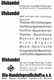 Neben Zeiss Ikon zeigte auf der einen Seite die Ufa-Handelsgesellschaft die von ihr angebotenen Projektoren, Tonfilmanlagen, Verstärker, Lautsprecher sowie Geräte für Theaterausstattung, auf der anderen die Leipziger Firma Nitzsche A.-G., ihre bekannten Theatermaschinen Matador I und II, sowie Spiegelbogenlampen und eine Tonaufnahmekamera.