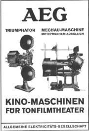Die AEG zeigte ihre bekannte Theatermaschine Triumphator III, das Projektorwerk in der den AEG-Typen seit Jahren eigenen Form mit dem kugelförmigen Gehäuse hinter dem Bildfenster, das die Ventilator-Kegelblende umschließt. Die infolge der immer größer werdenden Lichtansprüche ständig zunehmende Hitzeentwicklung im Bildfenster wird durch eine patentierte Verbindung der Kegelblende mit einem Luftkühlgebläse selbst bei größten Stromstärken ausreichend herabgemindert.