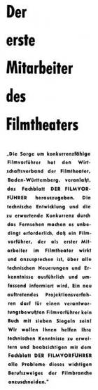 „Die Sorge um konkurrenzfähige Filmvorführer hat den Wirtschaftsverband der Filmtheater, Baden-Württemberg, veranlagt, das Fachblatt 'DER FILMVORFÜHRER' herauszugeben. Die technische Entwicklung und die zu erwartende Konkurrenz durch das Fernsehen machen es unbedingt erforderlich, daß ein Filmvorführer, der als erster Mitarbeiter im Filmtheater wirkt und anzusprechen ist, über alle technischen Neuerungen und Erkenntnisse ausführlich und umfassend informiert wird. Ein neu auftretendes Projektionsverfahren darf für einen verantwortungsbewußten Filmvorführer kein Buch mit sieben Siegeln sein! Wir wollen Ihnen helfen Ihre technischen Kenntnisse zu erweitern und beabsichtigen mit dem Fachblatt 'DER FILMVORFÜHRER' alle Probleme dieses wichtigen Berufszweiges der Filmbranche anzuschneiden."