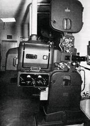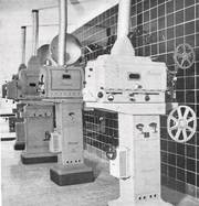 Beispiel eines vorbildlich eingerichteten Vorführraumes in den „ARKADIA-Lichtspielen" in Ludwigsburg, ausgerüstet mit 2 Bauer B12-Projektoren mit Klangfilm-Stereodyn-Magnettongerät, 1 Bauer Schmalfihn-Projektor SELECTION II O und 1 Bauer-Dia-Projektor -