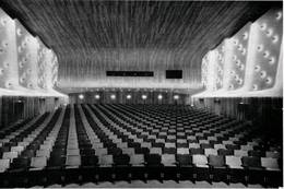 Um auch für die vordersten Sitzplätze gute Sichtverhältnisse zu schaffen, ist zwischen der ersten Reihe und der 16 x 10m großen Bildwand ein Abstand von 30m (Anmerkung : 30m Abstand sind unglaubwürdig) - vorgesehen. Zur Erreichung einer guten Raumakustik sind an den Seitenwänden und an der Rückwand des Zuschauerraumes Holzflächen aus 23mm starkem Teakholz und außerdem Rigipsflächen mit Lochung angeordnet. Die Decke des Zuschauerraumes wird zur Schalleitung benutzt und ist in ihrer Krümmung so gehalten, daß die von ihr reflektierten Schallstrahlen vorzugsweise auf die mittleren und hinteren Sitzplatzreihen geleitet werden.