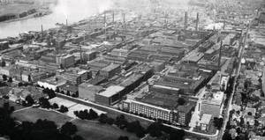 In der Aufarbeitung entstehen dann z. B. aus dem 1m breiten Filmband 30 schmale Bänder von je 35mm Breite, der Kinefilm. Die Herstellung der Emulsion, die Beschichtung und die weitere Verarbeitung erfolgt bei dunkelroter Arbeitsbeleuchtung. - Die untenstehende Luftaufnahme zeigt das Bayer-Werk in Leverkusen mit den AGFA-Fotofabriken rechts im Vordergrund. (Foto: AGFA)