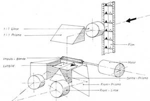 Die sich kreuzenden Projektionsstrahlen ergeben auf der stark gekrümmten Bildwand ein Bild mit dem Seitenverhältnis 1:2,64. Die Trennlinie, die sich durch das Zusammentreffen der beiden Teilbilder in der Mitte der Bildwand ergibt, wird durch eine rotierende Impulsblende nahezu unsichtbar gemacht. Man erhält bei diesem Verfahren große Bilder auf der breiten Wand mit dem Vorteil gegenüber den Verfahren mit mehreren gleichzeitig laufenden Filmen (Cinerama und Cinemiracle), daß normale Projektoren im Überblendbetrieb verwendet werden können und daß der technische Aufwand und der Filmverbrauch wesentlich geringer ist als bei den Mehrfilm-Verfahren, andererseits aber fast die gleiche Bildwirkung erzielt werden kann, wie mit den vorerwähnten Verfahren. - Die untenstehende Zeichnung erläutert schematisch die Wirkungsweise des Verfahrens und die optischen Einzelheiten des Projektionsvorsatzes, der sich aus Linsen und Prismen zusammensetzt und von Zeiss Ikon für den Anbau an die ERNEMANN VIII B entwickelt wurde. (Zeichnung: Zeiss Ikon)