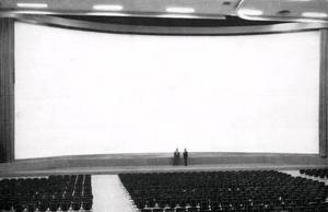 Die erste Bildwand in dieser Größenordnung in einem „umbauten Filmtheater", d. h. in einem geschlossenen Raum, wurde vor kurzem im Auftrag der Cinerama Inc., New York, für die Wiedergabe des Cinerama-Films „Südsee-Zauber" durch die Kinoton GmbH., München, in der „Gruga-Halle" in Essen mit den Abmessungen 13 x 35m eingebaut, und gilt damit als die bisher in der Welt aufgestellte größte Bildwand in einem geschlossenen Raum.