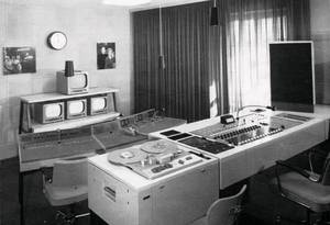 In einem besonderen Bild- und Tonregieraum mit kombiniertem Steuerpult, Regie- und Bildmischpult befindet sich außer diesen Einzelmonitoren noch ein besonderer Ausgangs-Monitor, der die jeweils für die Bildaufnahme bestimmte Szene aufzeigt. - Die Aufnahme zeigt einen Blick in den Regieraum im Bavaria-Atelier in Geiselgasteig. Näheres hierüber in Kürze. (Foto: Bavaria-Atelier GmbH)