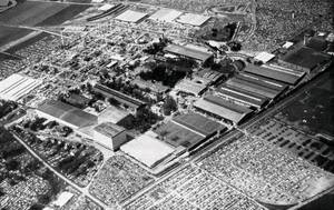 Die untenstehende Aufnahme des Messegeländes von Hannover vermittelt einen wirkungsvollen Eindruck von der gewaltigen Ausdehnung dieses internationalen Messeplatzes und zeigt neben dem Hallenkomplex in der Mitte des Bildes links das Freigelände mit den Ausstellungs- und Vorführungsplätzen der Großmaschinenindustrie, sowie oben und unten einen Teil der riesigen Parkplatzflächen.