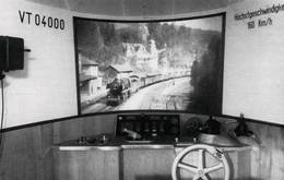 Im Zusammenwirken mit der Lautsprecheranlage entstand auf diese Weise der Eindruck einer wirklichen Fahrt mit dem TEE-Zug; die Landschaft flog auf den Beobachter zu, entgegenkommende Züge wurden in Bild und Ton naturgetreu erfaßt, wobei der Bildeindruck durch die CinemaScope-Projektion besonders effektvoll und eindrucksvoll gestaltet wurde und dem Zuschauer ein einmaliges Erlebnis vermittelte, das noch dadurch verstärkt wurde, daß auch das Surren der Triebwagenmotoren, die Fahrgestell-und Gleisgeräusche und die von Felswänden und Brückendurchfahrten zurückgeworfenen Geräusche naturgetreu erfaßt und wiedergegeben wurden. - Die untenstehende, von der Bildstelle der Deutschen Bundesbahn zur Verfügung gestellte Aufnahme zeigt den Führerstand der TEE-Lok mit dem Blick auf die Bildwand.
