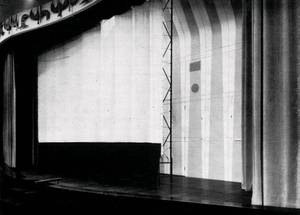 Normalerweise ist das Gestell des Bildwandrahmens fest auf der Bühne eingebaut und dient gleichzeitig für die Anbringung der Lautsprecher-Kombinationen. Es gibt aber auch Fälle, "wo" der Rahmen zeitweise entfernt oder zusammengeschoben werden muß, um die Bühne freizumachen. Hierfür wurde u. a. eine Konstruktion entwickelt, die das untenstehende Bild zeigt. (Foto: Film-Ton-Technik)