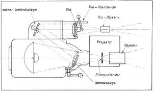 Wie aus der unten abgebildeten optischen Anordnung dieser Spiegel-Dia-Einrichtung ersichtlich ist, wird dabei das Licht des von der Xenonlampe kommenden Strahlenganges durch einen Konvexspiegel vollständig erfaßt und über einen ebenen Umlenkspiegel auf das Dia geworfen. Eine Kondensorlinse vor dem Dia, deren Brennweite der Objektivbrennweite entsprechend gewählt wird, sorgt für die Anpassung des Beleuchtungsstrahlenganges an das Projektionsobjekt. Dieser Konvexspiegel wirkt wie eine Zerstreuungslinse, d. h. er verlegt das durch den Hauptspiegel in der Nähe des Bildfensters entworfene Lichtquellenbild in die Gegend des weiter entfernt liegenden Diafensters und sorgt damit zugleich für die Ausleuchtung der - gegenüber der Filmbildfläche - größeren Diafläche.
