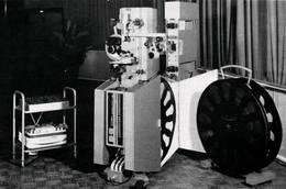 Die unten stehende Aufnahme zeigt den Solo-Automatik-Projektor, wie er auf dem Ausstellungsstand von Philips auf der photokina 1963 erstmals der Öffentlichkeit vorgestellt wurde. Links neben dem Projektor befindet sich auf einem fahrbaren Gestell das Bedienungspult; darunter ist ein Philips-Tonbandgerät für die automatische Steuerung der Dia-Projektion angeordnet. Die abgenommene vorderseitige Schutzkappe am Projektor läßt den ausschwenkbaren Automat und das Steuergerät erkennen. Rechts vom Projektor der Dia-Automat, der durch Impulse vom Tonbandgerät gesteuert wird. Neben der geöffneten trapezförmigen linken Trommel ist der fahrbare Spulenwagen mit einer 4000-m-Filmspule sichtbar, der zum Einsetzen der Spule auf die konische Spulenachse dient. (Foto: Philips/Kinoton)