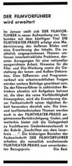 Im Januar stellt sich "DER FILMVORFÜHRER" in neuer Aufmachung vor. Verbunden mit dem künftigen Titel "DIE FILMTHEATER-PRAXIS" erfolgt eine Modernisierung des äußeren Bildes und eine Erweiterung des Inhalts. Die zusätzlich angesprochenen Themen umfassen innerbetriebliche Probleme, darunter Anregungen für eine rationeller ausgerichtete Arbeit, Hinweise für die Film- und Dia-Werbung sowie die Gestaltung der Innen- und Außen-Dekoration.