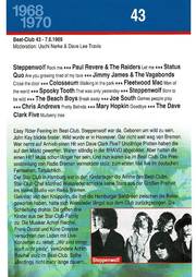 Steppenwolf Rock me *** Paul Revere & The Raiders Let me *** Status Quo Are you growing tired of my love *** Jimmy James & The Vagabonds Close the door *** Colosseum Walking in the park *** Fleetwood Mac Man of the world *** Spooky Tooth That was only yesterday *** Steppenwolf Born to be wild *** The Beach Boys Break away *** Joe South Games people play *** Chris Andrews Pretty Beiinda *** Mary Hopkin Goodbye *** The Dave Clark Five Mulberry tree
