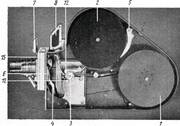 1 Abwickelspule, 2 Führungsrolle, 3 Vorwickeltrommel, 4 Filmschleife, 5 Filmkanal, 6 Filmschleife, 7 Nachwickeltrommel, 8 Zahntrommel, 9 Tonaufzeichnungstrommel, 10 Andruckhebel, 11 Filmschleife, 12 Zahntrommel, 13 Führungsrolle, 14 Aufwickelspule, 15 Lichtsteuergerät.