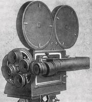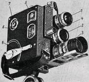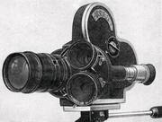 Bild IX. Bell u. Howell "Filmo Auto Master"-16mm-Kamera, mit Objektivrevolver, Kassettenladung (Kodak-Magazin) und Bildfrequenz Verstellung.