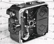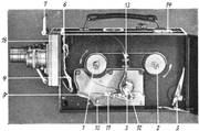 1 Aufwickelachse, 2 Abwickelachse, 3 Vor- und Nachwickel-Zahntrommel, 4 Greifer, 5 Fühlhebel für Filmzählwerk, 6 Filmkanal, 7 Sucherobjektiv, 9 Führungsblech, 10 Führungsstift, 11 Hebel, 12 Andruckhebel, 13 Zwischenblech, 14 Sucherokular.