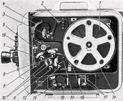 1 Filmband, 2 Außenkassette, 3 Kassettenführung, 4 Filmvorratskontrolle, 5 Zahntrommel, 6 Filmseitenführung, 7 Filmkanal, 8 Tonaufzeichnungstrommel, 9 Filmführungsrolle, 12 Luftdämpfung, 13 Führungsrolle, 14 Anlaufanzeige, 15 Tonaufzeichnungsgerät, 16 Sucher- und Entfernungsmesser-Ausblick, 17 Außenkassette.