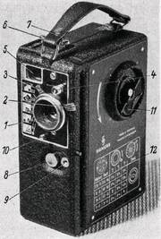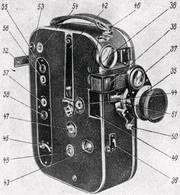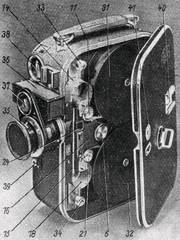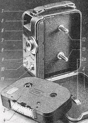 1 Kameragehäuse, 2 Kameradeckel, 3 Kassette, 4 Filmband, 5 Sucher, 6 Blendenskala, 7 Aufnahme-Optik, 8 Einstellhebel Laufbild—Einzelbild, 9 Entfernungsskala, 10 Auslöseknopf, 11 Einstellung der Bildfrequenz, 12 Ab-wiekeldorn, 13 Abwickelachse.