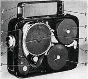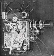 1 Aufnabmeobjektiv, 2 Traggriff, 3 Sucherobjektiv, 4 Sucherokular, 5 Abwickelspule, 6 Vor- und Nachwickelzahntrommel mit eingebautem Federwerk, 7 Filmschleife, 8 Filmkanal, 9 Filmschleife, 10 Aufwickelspule, 11 Fühlhebel für Filmzählwerk.