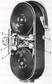 1 Vorwickelzahntrommel, 2 Nachwickelzahntrommel, 3 Filmschleifen, 4 Filmandruckplatte, 5 Suchereinblick.
