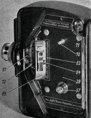 13 Greifer, 28 Platine, 57 Aufwickelachse, 61 Bildfenster, 63 Filmandruckplatte, 64 Einleghebel, 65 Andruckrahmen, 70 Abwickeldorn, 71 Zählwerkseinstellung.