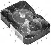1 Abspul-Filmwickel, 2 Aufspul-Filmwickel, 3 Filmband, 4 Kassettengehäuse, 5 Filmführungskanal, 6 Kassettenausschnitt, 8, 9 Federn, 10 Aufwickeldorn, 11 Abwickeldorn, 13 Schutzschieber für Filmband. 14 Sicherungsstift.