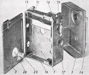 1 Kastenrahmen, la Durchbruch für Verriegelungsknopf, lb Durchblick für Filmmeterzähler, lc Sucherschacht, ld Fassung für Sucherobjektiv, 1e Fassung für Aufnahmeobjektiv, lf Ausschnitt für Auslöseknopf, 2 Schraubdeckel, 2 a Durchbruch für Aufzugskurbel, 2 b Halterung für Kurbelgriff, 3 Klappdeckel, 3 a Deckelscharnier.