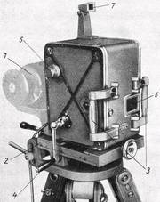 1 Antriebsmotor, 2 Stativ, 3 Handgriffe, 4 Aufzugskurbel für Federwerk, 5 Bildfrequenz-Einstellung. 6 Ausschnitt für Lichteinfall, 7 Sucher.