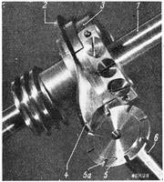 1 Antriebswelle, 2 Verriegelungskurve, 3 Schaltwalzenkörper, 4 Schaltkurve, 5 Schlitzrad, 6 Schlitzradwelle, Schaltverhältnis S =1:6.