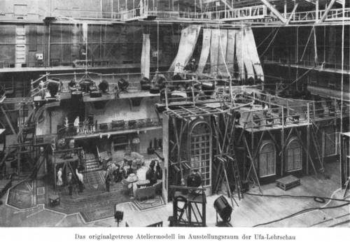 Ein naturgetreues Modell eines Ateliers zeigt den praktischen Einsatz der Vorarbeiten bei der Aufnahme. Der Filmbau und die Atelierwand sind an einer Seite geöffnet, so daß man die Dekorationsbauten, die Brückenbauten für die Scheinwerfer, die Einrichtung der Beleuchtung, die Einstellung der Kameras (zweier stehender und einer fahrenden Kamera), die Anbringung der Mikrophone, die Verbindung der Tonbox zu den Mikrophonen und der Bildkamera, die akustische Abdeckung der Räume, die Anlage der elektrischen Kabel usw. deutlich erkennen kann.
