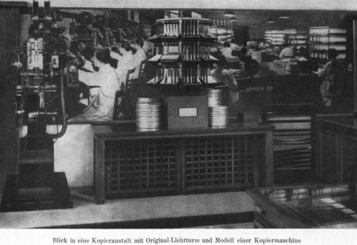 Ein bewegliches Modell, verbunden mit zahlreichen Abbildungen und Großphotos, verdeutlicht die praktische Arbeit der Kopieranstalt. Aus dem Atelier werden zwei Filmstreifen mit unsichtbaren, latenten Photographien in die Kopieranstalt geliefert: die photographische Aufnahme der Bildeinstellungen und die photographische Aufnahme der Tonaufzeichnungen.