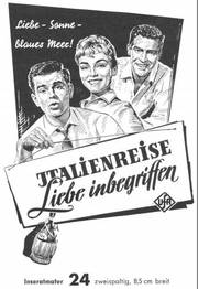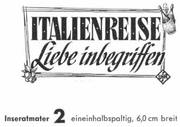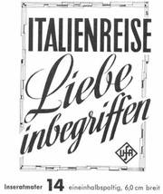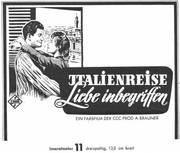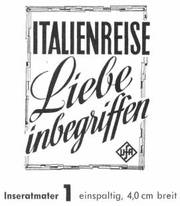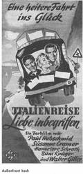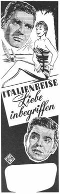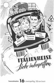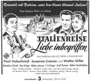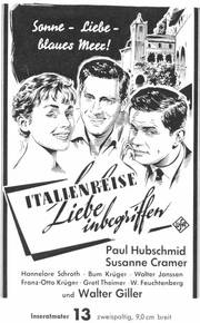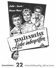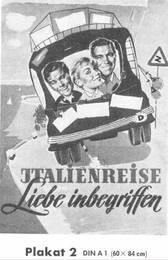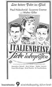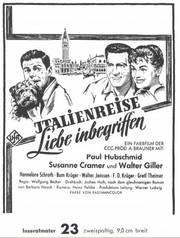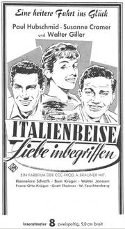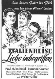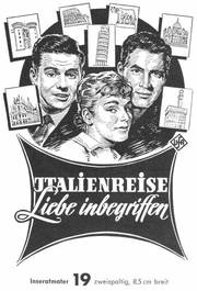Unter dem Einfluß von Chianti und der Romantik einer Italienreise entwickelt sich zwischen Herrn Primus (Walter Feuchtenberg) und Frl. Herzberg (Hannelore Schroth) ein herzliches Verhältnis - in dem CCC-Farbfilm im UFA-Filmverleih .Italien-re.,se.7"i-iebe '"begriffen". In den weiteren Rollen: Paul Hubschmid, Susanne Cramer, Walter Giller, Bum Kruger u. v a