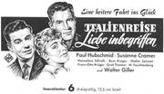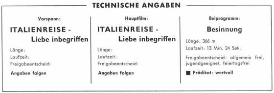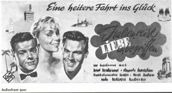 Auf einer romantischen Italienfahrt weiß eine junge Dame (Susanne Cramer) plötzlich nicht mehr, welchem von zwei Männern (Paul Hub-schmid und Walter Giller) ihr Herz nun wirklich gehört. Wie die Geschichte zuletzt ausgeht, erzählt mit Humor der CCC-Farbfilm Jta-Menreise - Liebe inbegriffen". Weltvertrieb: UFA-Filmverleih.