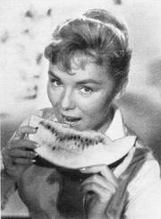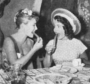 Bayerische Bräuche jenseits der Alpen! Auch in Italien lassen sich die beiden jungen Damen die Würstchen munden. - Eine Szene aus dem CCC-Farbfilm im UFA-Filmverleih „Italienreise - Liebe inbegriffen" mit (von links) Susanne Cramer und Hannelore Schroth. In den weiteren Rollen: Paul Hubschmid, Walter Giller, Bum Krüger, Walter Koch u. v. a.