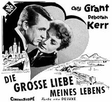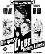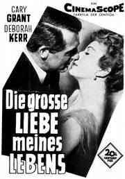 - „Reizend erzählte Liebesgeschichte nach dem einstigen McCarey-Schlager „Ruhelose Liebe" vor einer erregenden Kulisse. Schicke Besetzung und eine geglückte Verbindung von Lachen und Weinen mit einem zufriedenstellenden Ausgang. ,DIE GROSSE LIEBE MEINES LEBENS' ist ein Film, den die Zuschauer nicht so schnell vergessen werden. Unter der unnachahmlichen Regie von McCarey entstand ein Film mit Witz, der sowohl dem intellektuellen als auch nichtintellektuellen Geschmack entspricht und ohnefalsche Sentimentalität an das Gefühl appelliert. ... Die exquisite Ausstattung bildet einen eindrucksvollen, farbenfreudigen Hintergrund für die beiden Hauptdarsteller Cary Grant und Deborah Kerr. Miss Kerr, in diesem Film von Charles LeMaire angezogen, sieht vorteilhafter aus als je zuvor, eine Tatsache, die bei dem Publikum, vor allem bei den Damen, Beachtung und Bewunderung erregen wird, sofern sie nicht zu sehr damit beschäftigt sind, mit Cary Grant zu liebäugeln. Das Drehbuch wurde von Delmer Daves und McCarey geschrieben und enthält fünf Schlager von Harry Warren, Harold Adam-son und McCarey, von denen der Titelsong, von Vic Damone auch auf Schallplatte gesungen, der populärste ist. Der Film mit seinem betonten Liebesthema ist ausgezeichnete Produktion und Regie zugleich und seine populären Stars dürften allein schon einen der größten Kassenschlager des Jahres garantieren." Film Daily