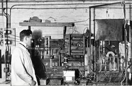 Das für unsere Glasarbeiten notwendig gewordene Vakuumlaboratorium mitsamt der Glasbläserei fand schließlich seinen Platz in einem kleinen, mit zwei Lichtluken aus Glasziegeln versehenen Kohlenkeller, nachdem der Koks heraus-