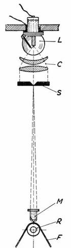Zur Erläuterung dieses Schemas sei folgendes erwähnt: Der von der Lichtquelle, der Lampe L, ausgehende Lichtstrom wird von einem Kondensatorensystem C aufgenommen und als ein sich schwach verengendes Lichtbündel über den dazwischen angeordneten gekrümmten Spalt S in das Mikroskopobjektiv M geworfen.