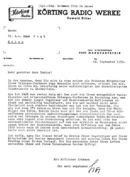 Als ich 1928 zum ersten Male mit dem auch von Ihnen massgeblich beein-flussten und mitgeschaffenen Triergon-Verfahren in Berührung kam, war ich als damals junger Ingenieur und Elektroakustik-Beflissener so stark und nachhaltig beeindruckt, wie vor und nachher nicht mehr. Vielleicht noch stärker beeindruckt war ich von der Tatsache, die mir vor etwa 1^2 Jahren zu Ohren kam und die besagte, dass die Nachfolger der Tobis, Berlin heute noch mit der von Ihnen und Ihren Miterfindern entwickelten Aufzeichnungslampe einschliesslich des auch schon bei Triergon in seinen Grundzügen vorhandenen Tobis-RC-Verstär-kers ohne irgend eine Veränderung arbeiten. Es ist wohl eine der erstaunlichsten Erscheinungen auf dem nun wirklich an Neuerungen nicht armen Gebiet der Elektroakustik, dass eine Erfindung aus dem Jahre 1922 heute nach 28 Jahren noch unverändert konkurrenzfähig, ja qualitativ noch nicht überholt ist.