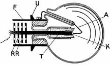 Bei dieser trägheitslosen Lichtquelle, wir nannten sie »Ultrafrequenzlampe«, (sie wurde bis 100.000 Hertz untersucht) besteht die Kathode K aus einem mit Wärme abstrahlenden Radiatoren RR versehenen Kupferstab, der über einen Platinkragen in das Glasgefäß eingeschmolzen ist. An der vorderen Seite trägt er zur Vermeidung der Metallzerstäubung eine Kalotte aus Wolfram.