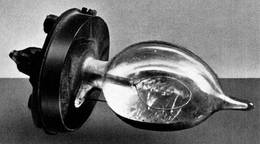 Die Abb. 24 zeigt eine für die Wiedergabe unserer Filme von uns hergestellte fotoelektrische Zelle mit der erwähnten Kaliumschicht als Kathode. Der kleine Draht in der Mitte ist die Anode. Im Gebrauch liegt an ihr eine Spannung von etwa hundert Volt. Sie bildet, kaum geändert, auch heute noch das »Auge« jeder Kinowiedergabe-Einrichtung. Für den praktischen Gebrauch sind diese leicht zerbrechlichen Dingerchen in kleine Büchsen gepackt. Die Abb. 25 zeigt eine solche betriebsfertige Zelle.