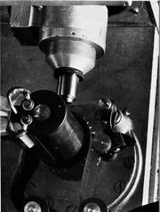 Die Abb. 27 zeigt in der praktischen Ausführung den unteren Teil eines solchen Abbildungssystems, angebaut an einen Tonfilmprojektor, ferner den Tonfilm mit dem verbreiterten Rand, in der Mitte die den Film tragende und antreibende Laufrolle sowie die in die Laufrolle hineinragende, mit Anschlußklemmen versehene fotoelektrische Zelle.