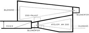 Die untenstehende Skizze zeigt die Aufgliederung dieses interessanten Theaterneubaues im Schnitt, aus der man erkennt, in welcher geschickten Weise es hier den Architekten gelungen ist, ein Haus mit 1204 Plätzen mit einem kleineren mit 550 Plätzen, so ineinander zu verschachteln, daß sich in beiden Theatern eine horizontale Projektion und durch starke Abschrägung des Parketts auch gute Sichtverhältnisse von allen Plätzen ergeben. Der Fußboden des großen Hauses bildet zugleich die Decke des darunter liegenden kleinen Hauses. Auf diese Weise konnte im großen Haus eine Bildwand von 10 x 20m, im kleinen Haus eine solche von 5 x 12m untergebracht werden.