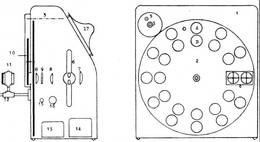 Der DIAMATIC-Werbeprojektor, der unten schematisch dargestellt ist, besteht aus einer drehbaren Scheibe, die von einem Motor über Schützsteuerung angetrieben wird, auf der je nach Bedarf 12 oder 24 Diapositive eingespannt sind. Für die Blink-Trick-Vorführung werden zwei Diasitive (A und B) benutzt.